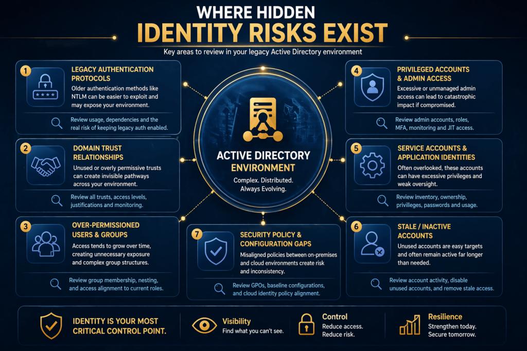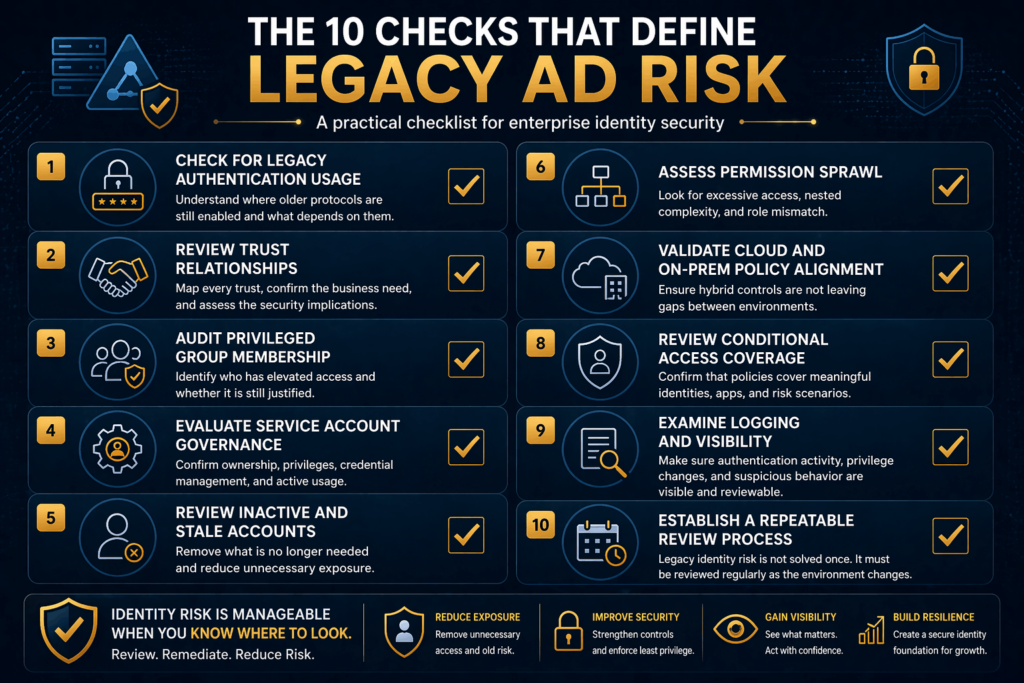 Below are some of the most important areas to review in a legacy AD environment. These are not random technical checks. They are places where risk tends to accumulate over time in large and growing organizations.